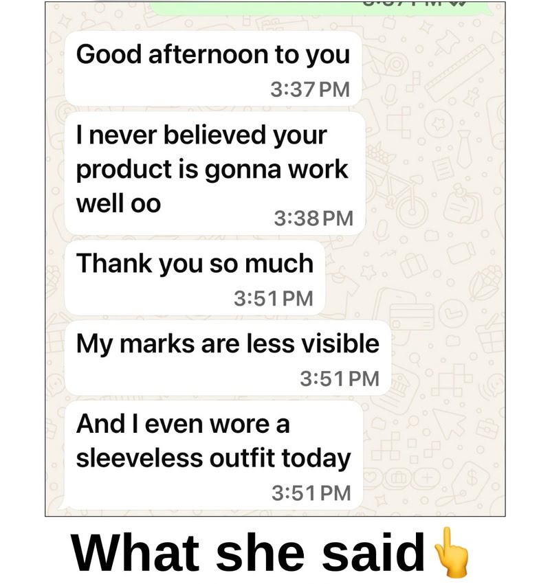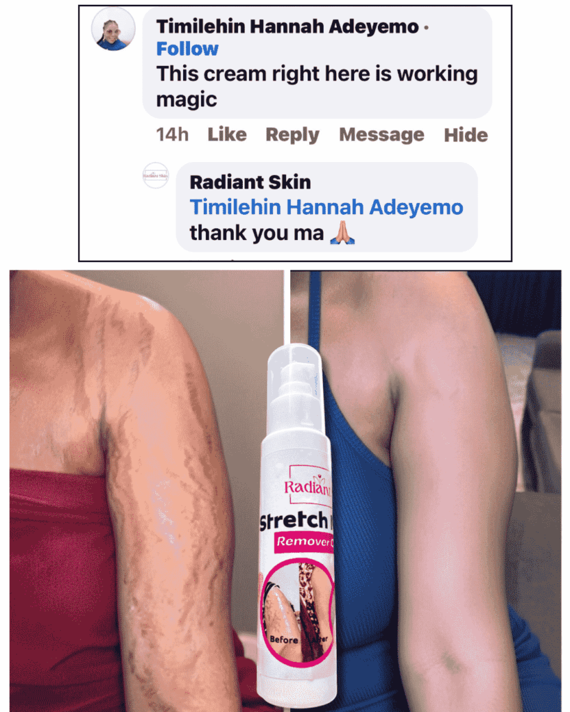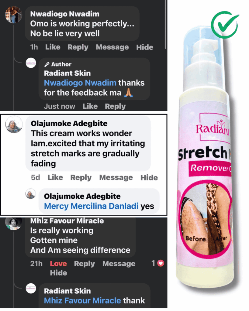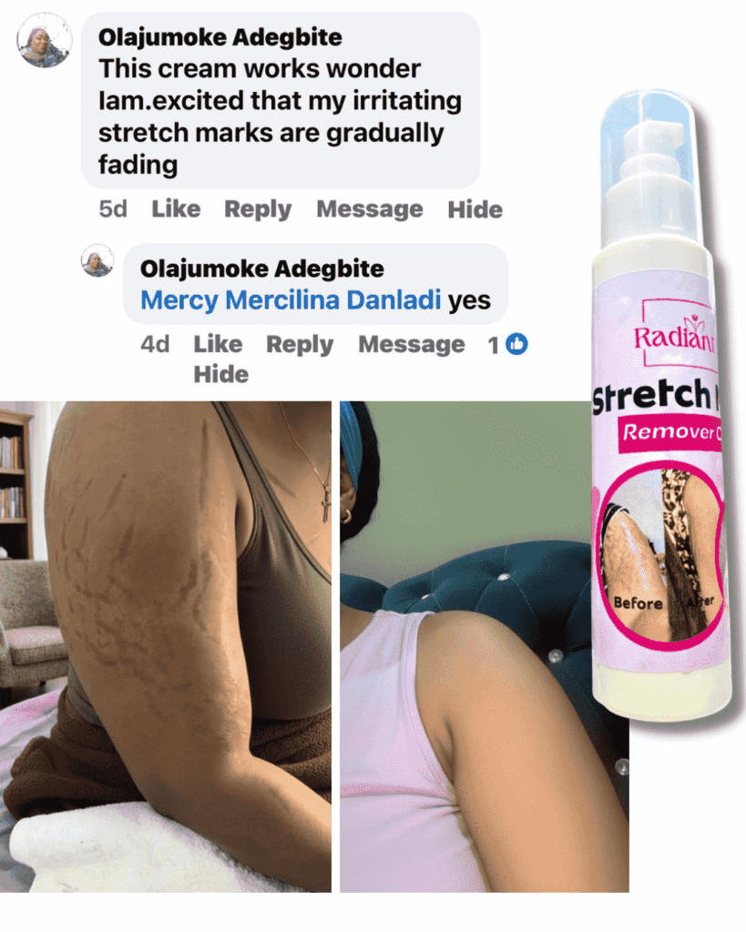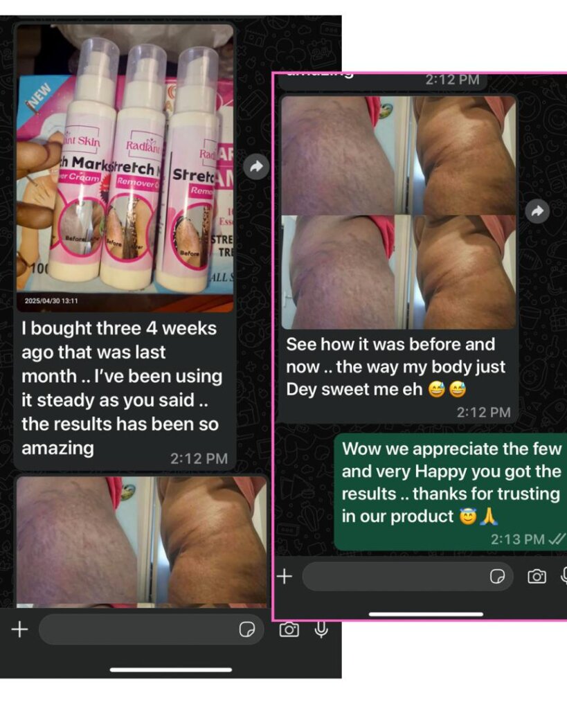 “Stretch marks have always bothered me, especially on my arms. This cream started working within two weeks, and now they’re barely visible. I’ve never seen a product like this – 100% recommend it for anyone who’s tired of struggling with stretch marks!” — Blessing K., Enugu