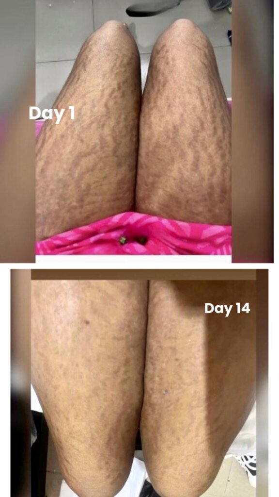 📅 Day 7: My skin started looking smoother 📅 Day 14: Massive fading of stretch lines 📅 Day 21: Most marks almost gone 📅 Day 30: Stretch marks barely visible!